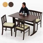 このダイニングセットは、4人用として設計されており、テーブル1台にチェア2脚、そして背もたれ付きのベンチ1台がセットになっています。家族4人がゆったり座れるサイズ感が魅力です。